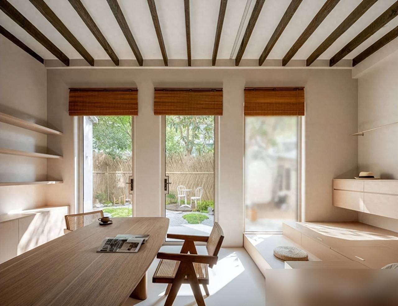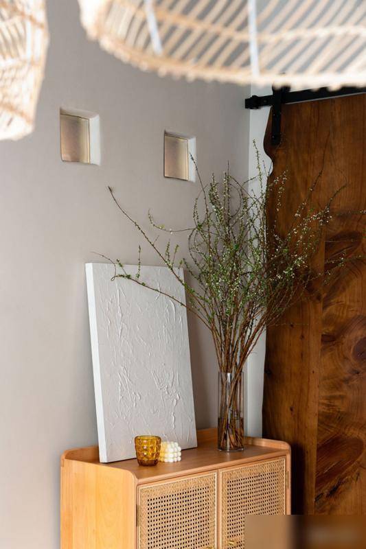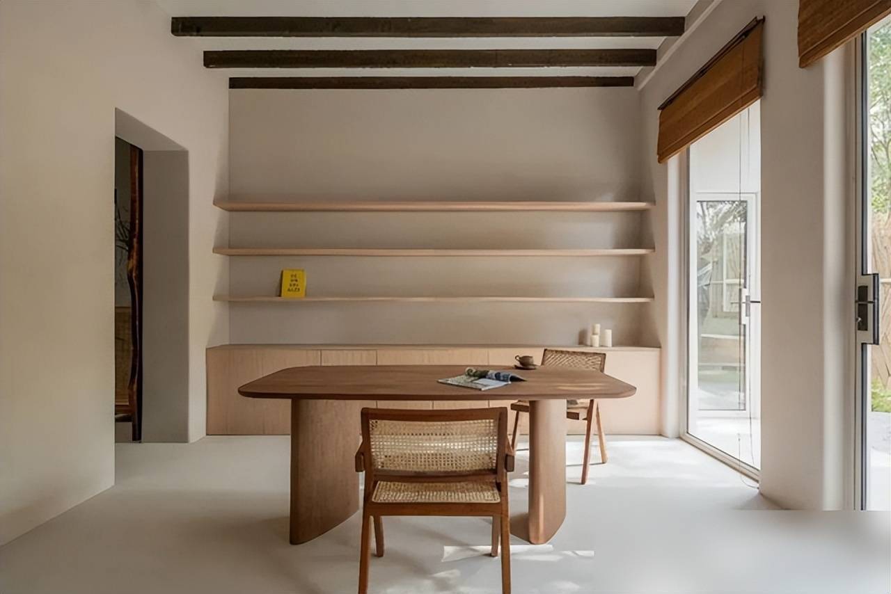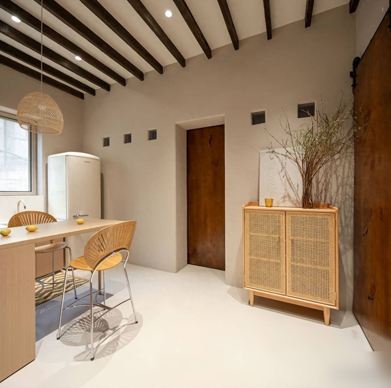 微水泥墙面带着手工涂抹的斑驳,原木家具留着天然木疤,乍看有点“破旧”,细品全是生活的温度。网红风像加了滤镜的美颜,初看惊艳却不耐看;侘寂风却像老茶,越泡越醇厚。藤编柜、麻质窗帘这些质朴元素,不张扬却治愈,让人一进门就松口气。现在人装修总爱比谁家更豪华,可这对母女用行动说话:家不是展览馆,堆满东西反而压得人喘不过气。能坐在小窗边看花园,听着竹筒滴水声发呆,这种“做减法”的生活态度比镶金边的装修珍贵多了。