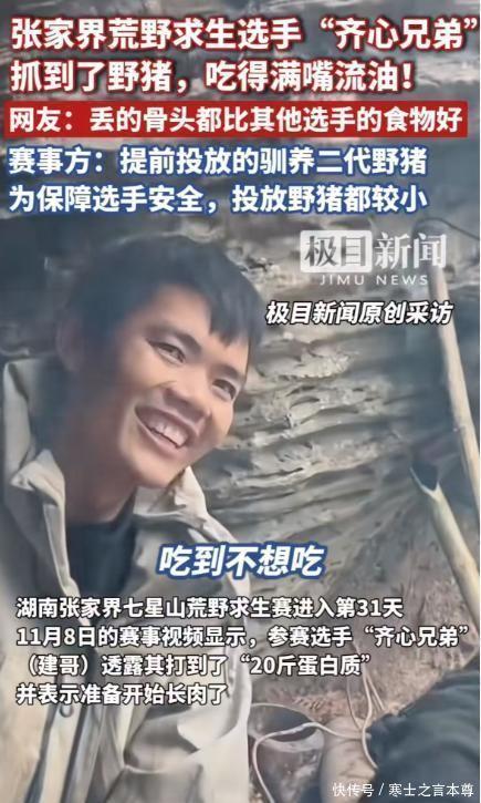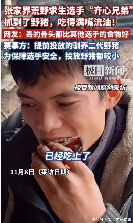 生存众生相 原来, 兄弟俩抓到的确实是节目组提前投放的二代野猪 。 这些野猪并非野生,而是人工驯养的品种,为了保障选手安全,投放的都是体型较小、攻击性较低的个体。 主办方表示,投放这些动物并非为了投喂选手,而是为了增加比赛的趣味性和挑战性,让选手们有机会体验更真实的荒野生存技能,毕竟比赛是荒野求生,不是荒野求死。 随着比赛推进,17名幸存选手的生存方式,呈现出截然不同的“众生相”,也让这场比赛的看点远超吃什么的争议。